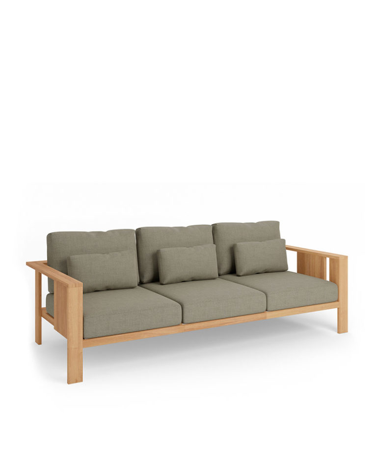 The sober and rationalist lines of this iroko wood outdoor sofa draw a piece of powerful presence and versatility, easily adaptable to any style setting. Looking at its design in detail the way the different planes and sizes of the slats achieve a subtle graphic expression as the only decorative feature. The piece includes high resistance seat and back cushions.