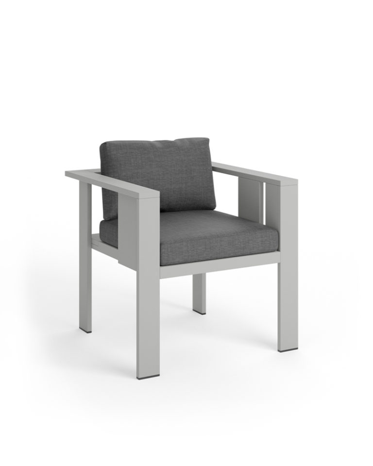 The sober and rationalist lines of this aluminum outdoor chair draw a piece of powerful presence and versatility, easily adaptable to any style setting. Looking at its design in detail, the way the different planes and sizes of the slats achieve a subtle graphic expression as the only decorative feature. The piece includes high resistance seat and back cushions.