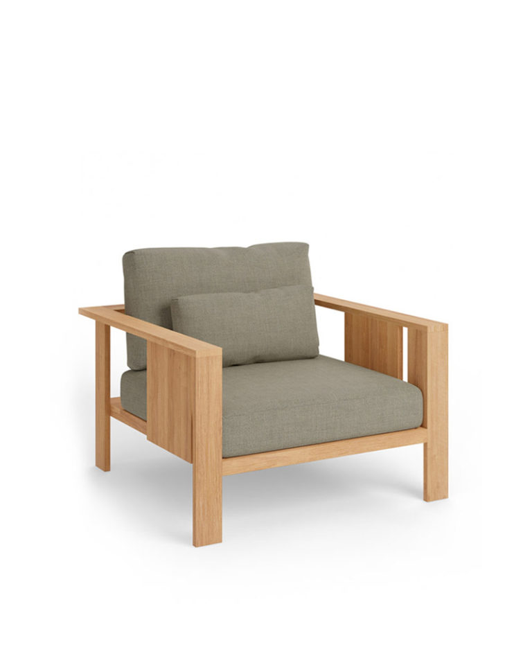 The sober and rationalist lines of this individual outdoor sofa, made of iroko wood, draw a piece of powerful presence and versatility, easily adaptable to any style setting. Looking at its design in detail the way the different planes and sizes of the slats achieve a subtle graphic expression as the only decorative feature. The piece includes high resistance seat and back cushions.