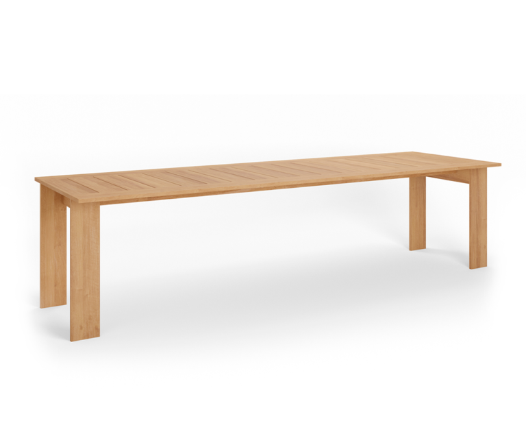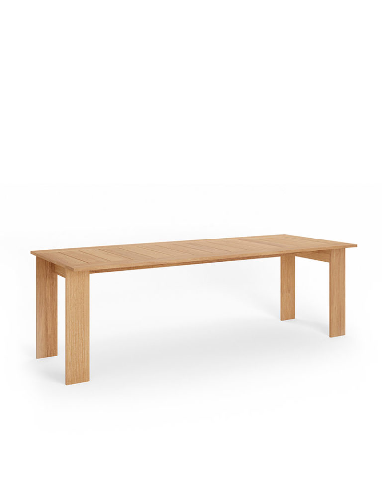 The sober and rationalist lines of this outdoor table draw a piece of powerful presence and versatility, easily adaptable to any style setting. Looking at its design in detail the way the different planes and sizes of the slats achieve a subtle graphic expression as the only decorative feature.