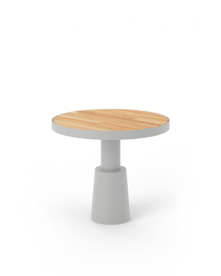 A collection of occasional tables that takes its name from musical drums, and whose geometric and circular simplicity is designed to enhance the melody of any outdoor furniture proposal. This version with a conical base is made of aluminum and an iroko wood top.
