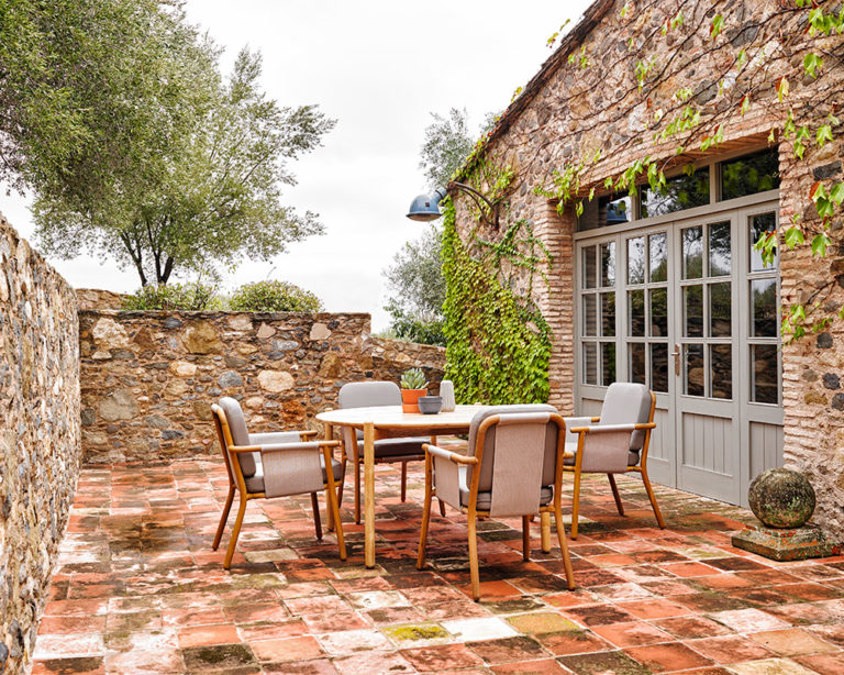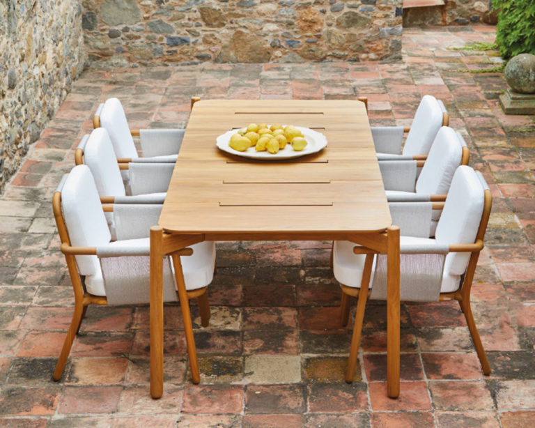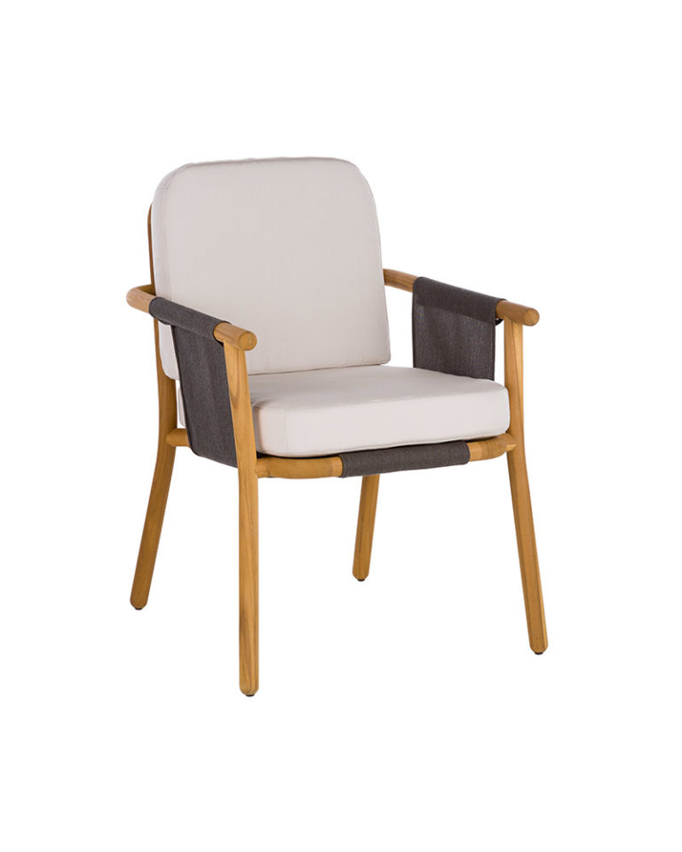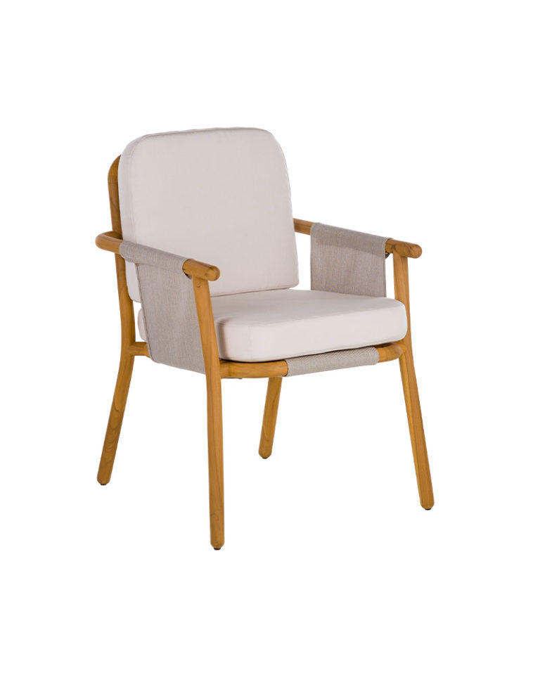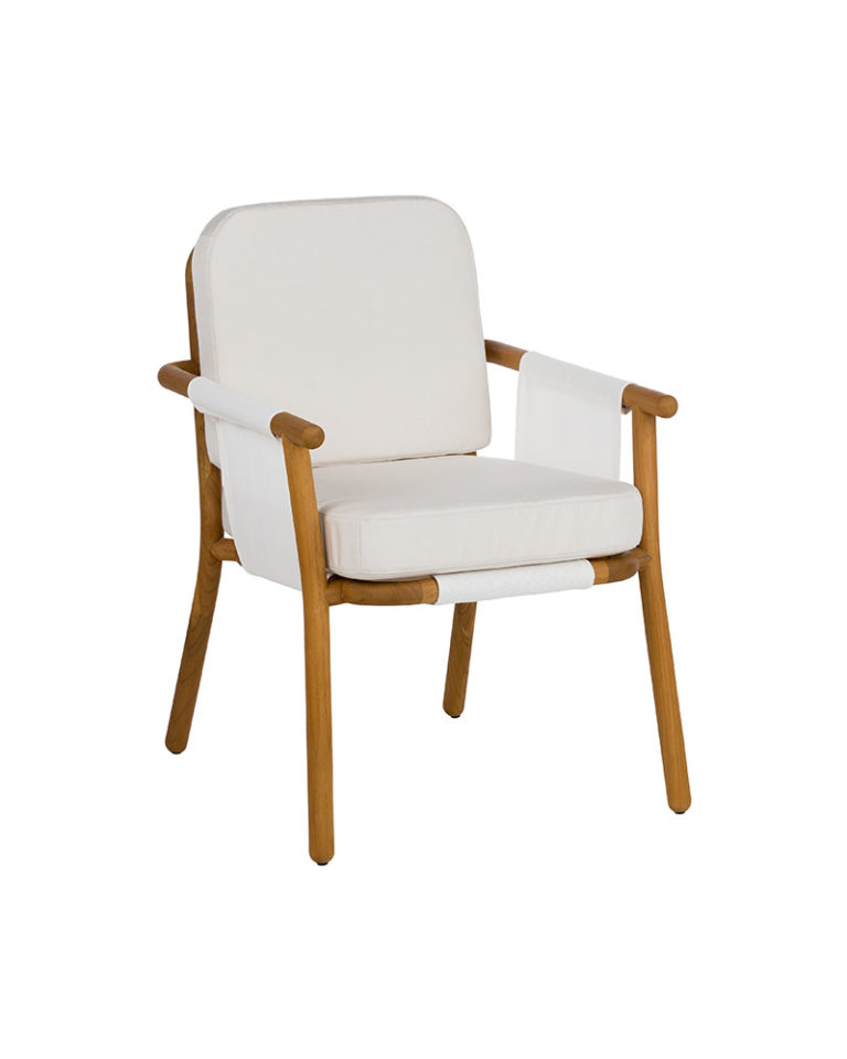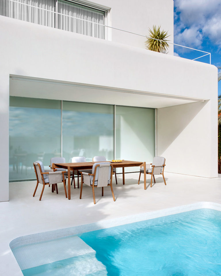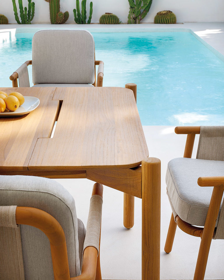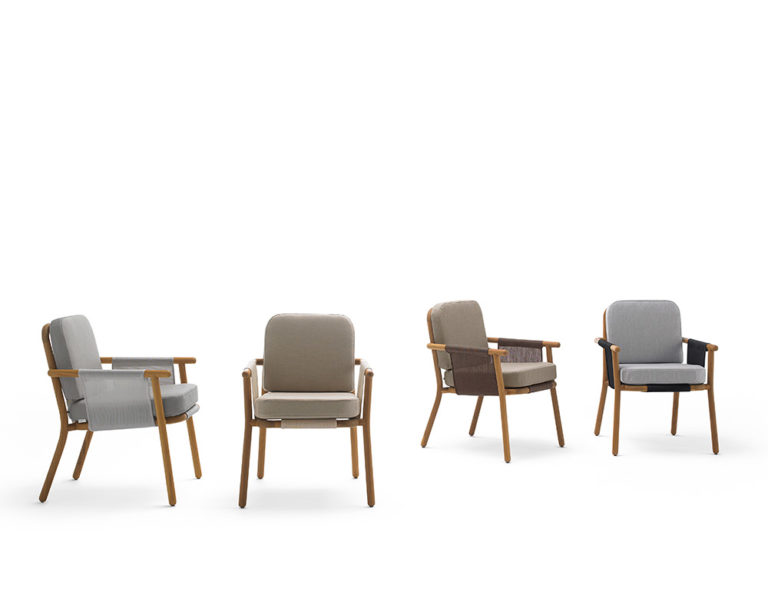 A neo-minimalist armchair whose language is based on the quality of the natural teak wood. With great technical complexity, the wood has been turned and bent creating a piece full of expressiveness. A structure that using a stretched PVC fabric sets up the base and the backrest to support the high resistance seat cushion in polyurethane.