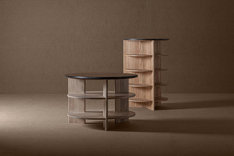 The dining and coffee tables complete the collection with the same narrative in oak wood but with the option of a stone top. One of the side tables, on the other hand, is distinguished by its ingenious rotating top that opens to extend the functional space.