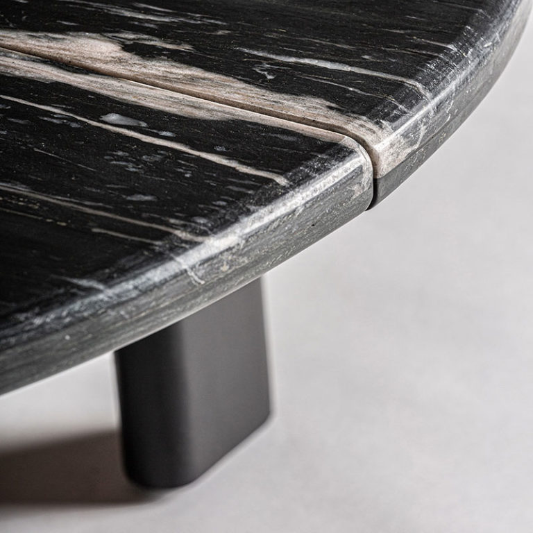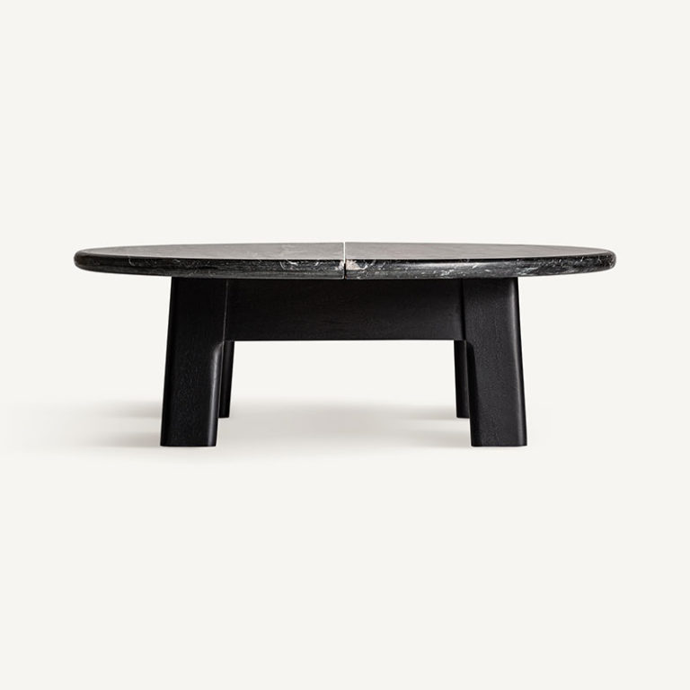 The dining and coffee tables complete the collection with the same narrative in oak wood but with the option of a stone top. One of the side tables, on the other hand, is distinguished by its ingenious rotating top that opens to extend the functional space.