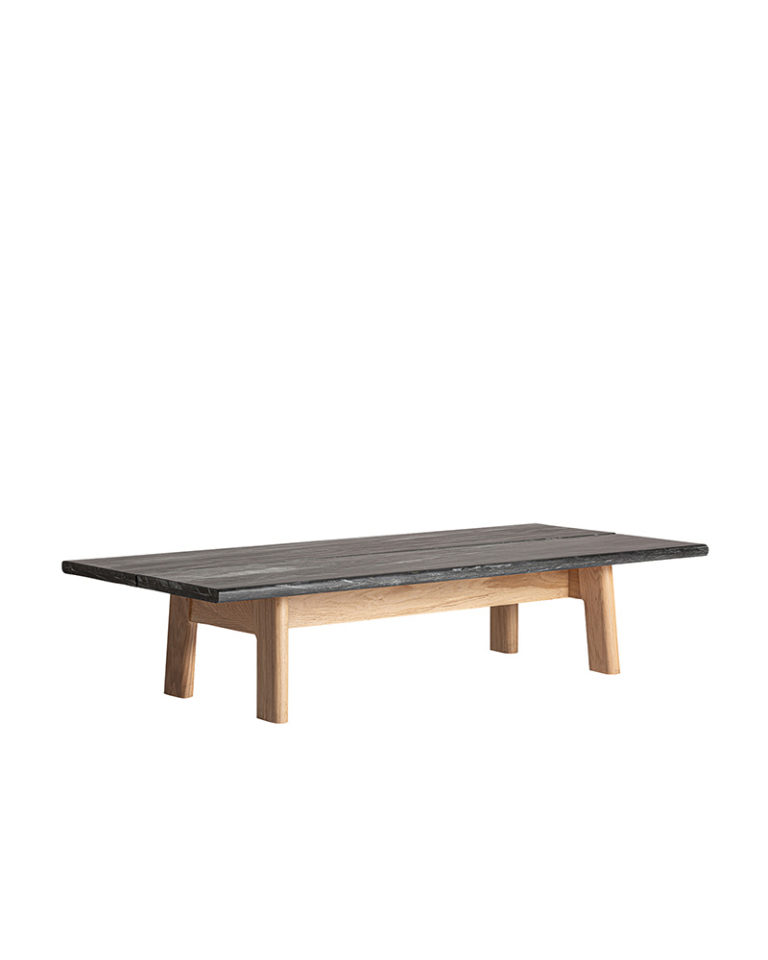 The dining and coffee tables complete the collection with the same narrative in oak wood but with the option of a stone top. One of the side tables, on the other hand, is distinguished by its ingenious rotating top that opens to extend the functional space.