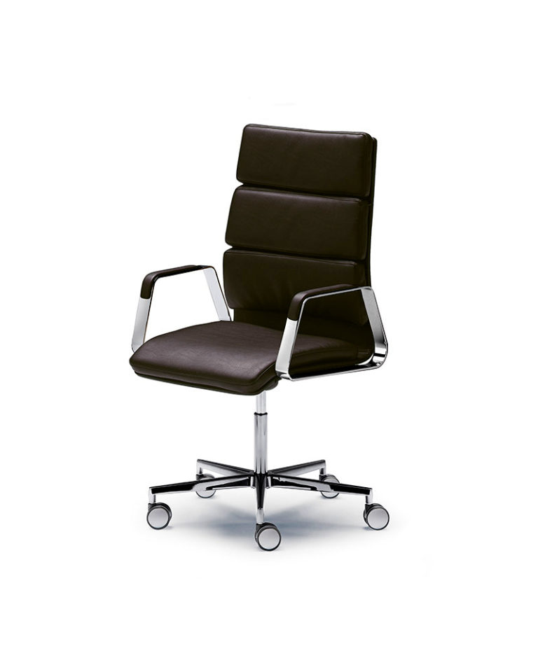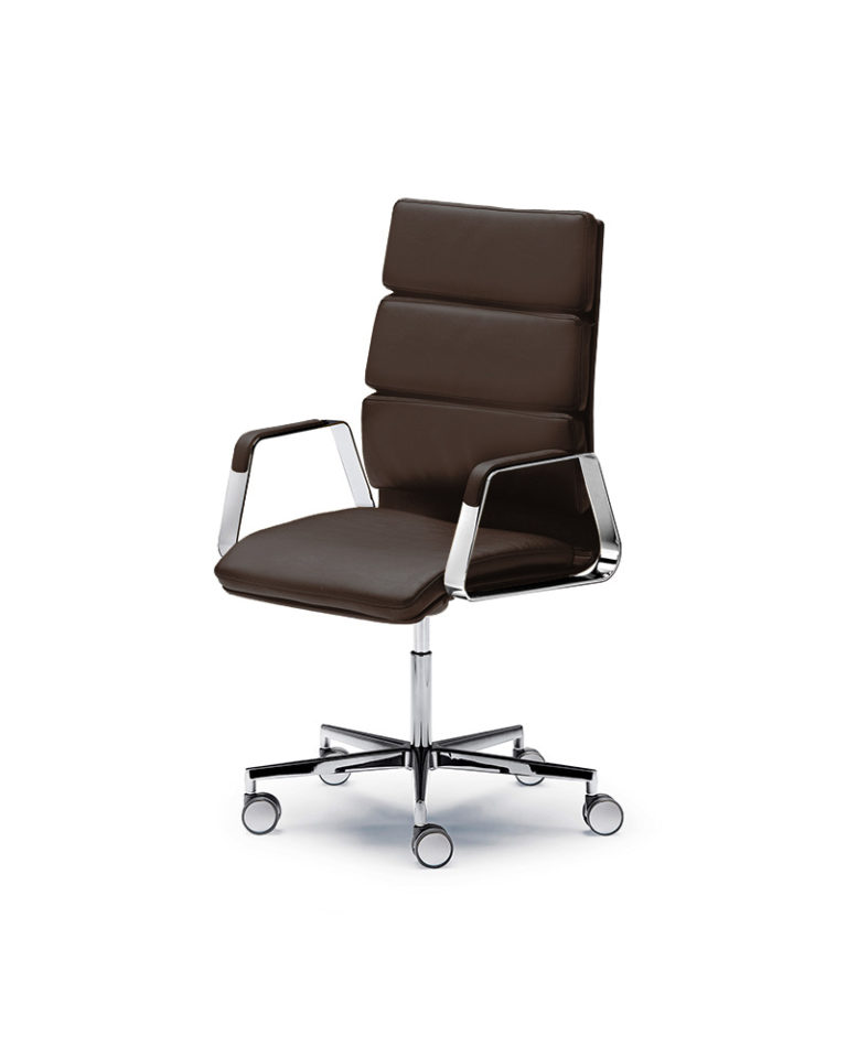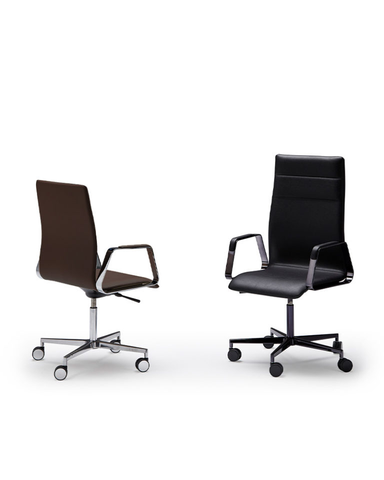 The executive ONNA chair is functional and refined. A nostalgic design, which translates the configuration of the classic office chair into contemporary proportions. Upholstered in tech-leather, its comfort version incorporates a higher density padded seat and back for a better experience. Five-axis base with castors. Tilting system, height adjustable and reclining.