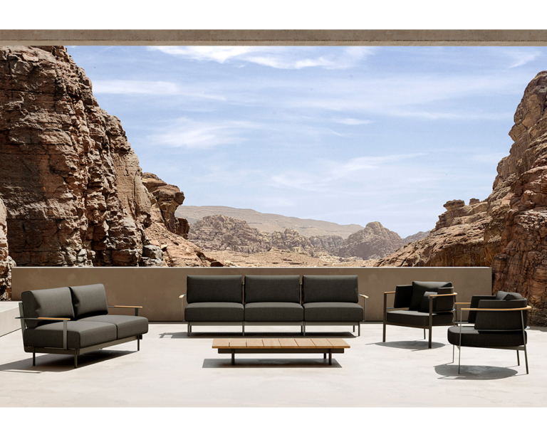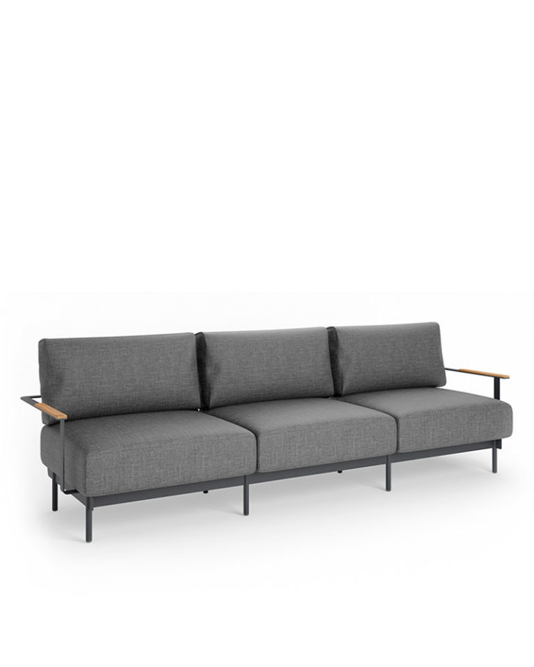 With a clean and refreshing design scheme, this outdoor sofa is characterized by a weave of ribbons that completely wraps its backrest and creates an interesting connection with the aluminum and cushions. Its structure mixes rectangular plates with tubular legs and iroko wood armrests.