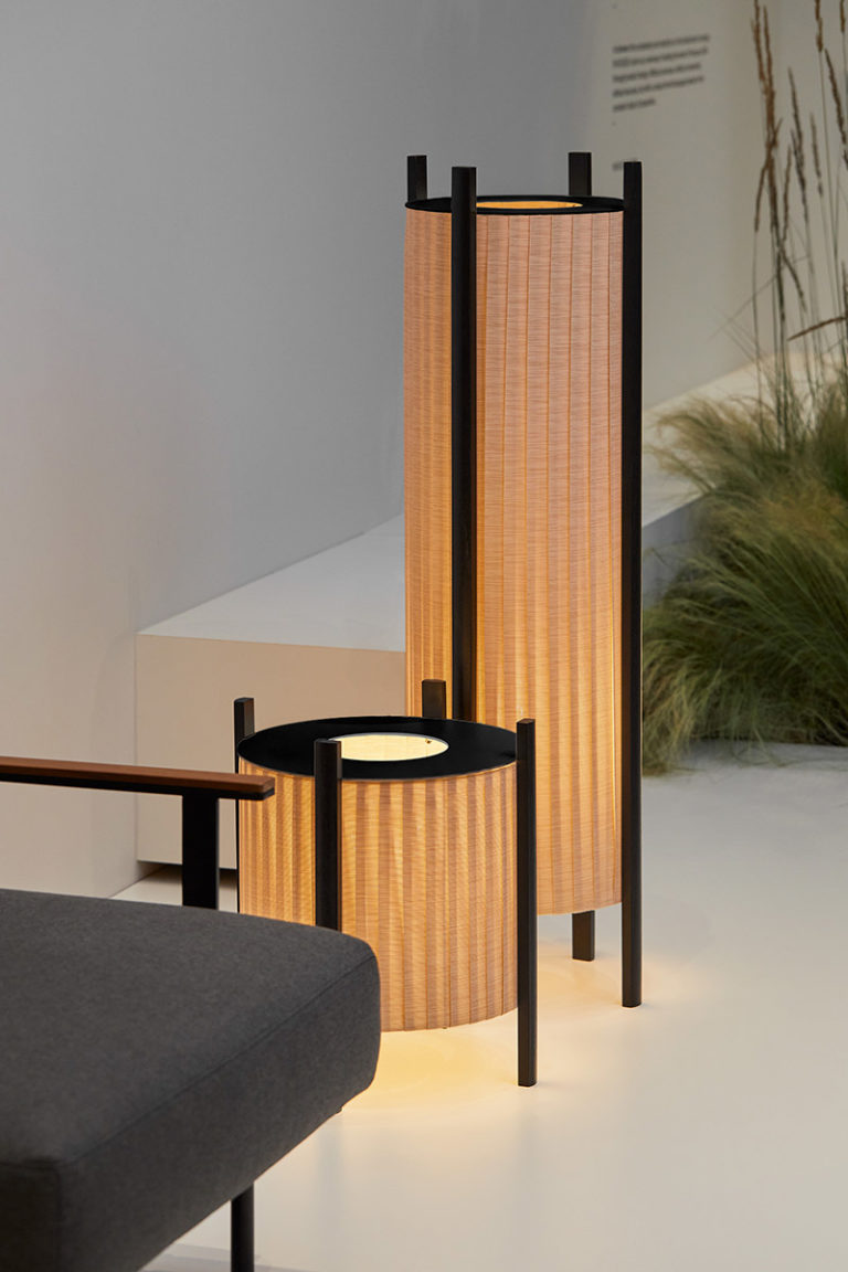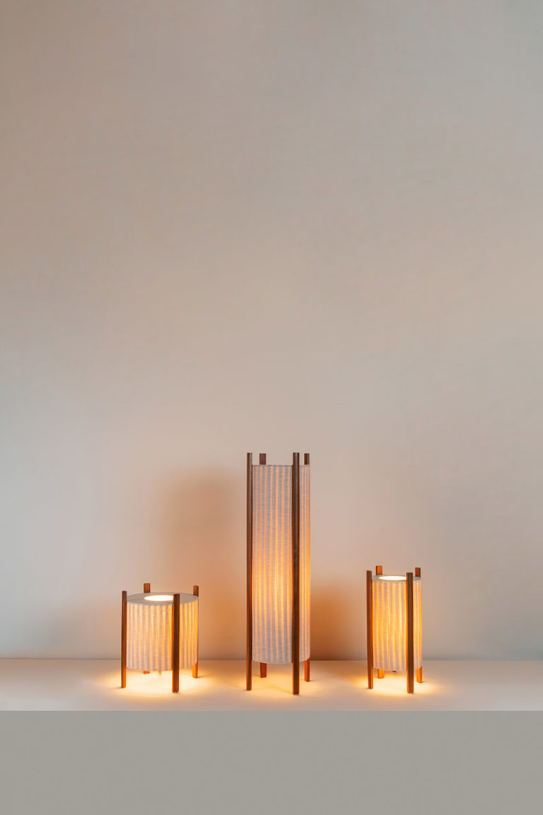 Projected as a cylinder, this new lamp designed for Milan is built essentially through ribbons that wrap around the light while a flat metal disk partially covers the upper part, keeping it hidden. The four wooden legs that lift and support the body share a flat rounded shape that contributes to its simplicity and overall lightweight feel. The finish on the legs, available in natural or lacquered wood, defines the final identity of the piece. A design made from materials that are also suitable for outdoors.