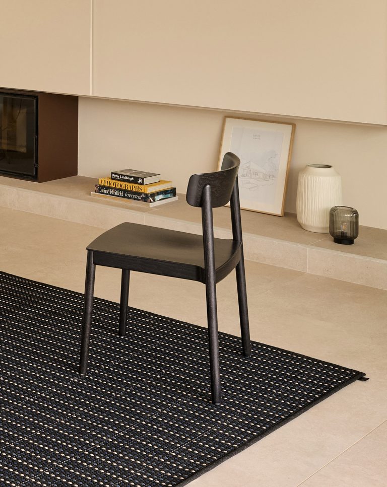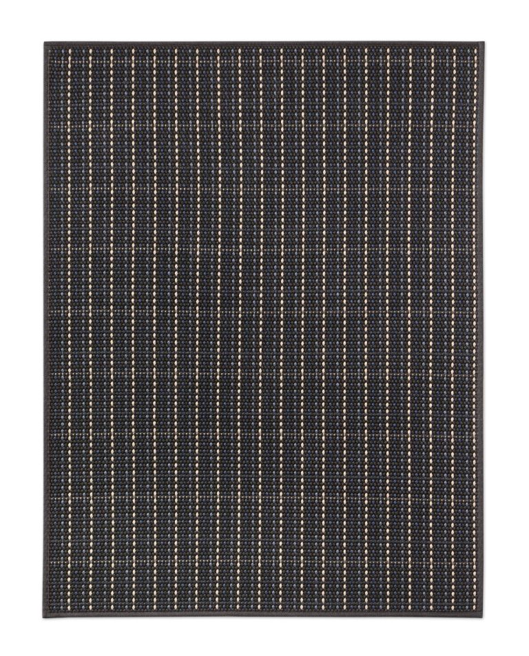 Indoor and outdoor rug in dark blue, black and sand tones. Designed by Francesc Rifé for Rols Carpets, Aral 05 is part of a collection that brings order to space through rhythm, repetition and light. This model begins in shadow: it combines two shades of blue with a black background and subtle accents in sand, softening the overall composition. A rug with strong character, ideal for serene and sophisticated spaces.