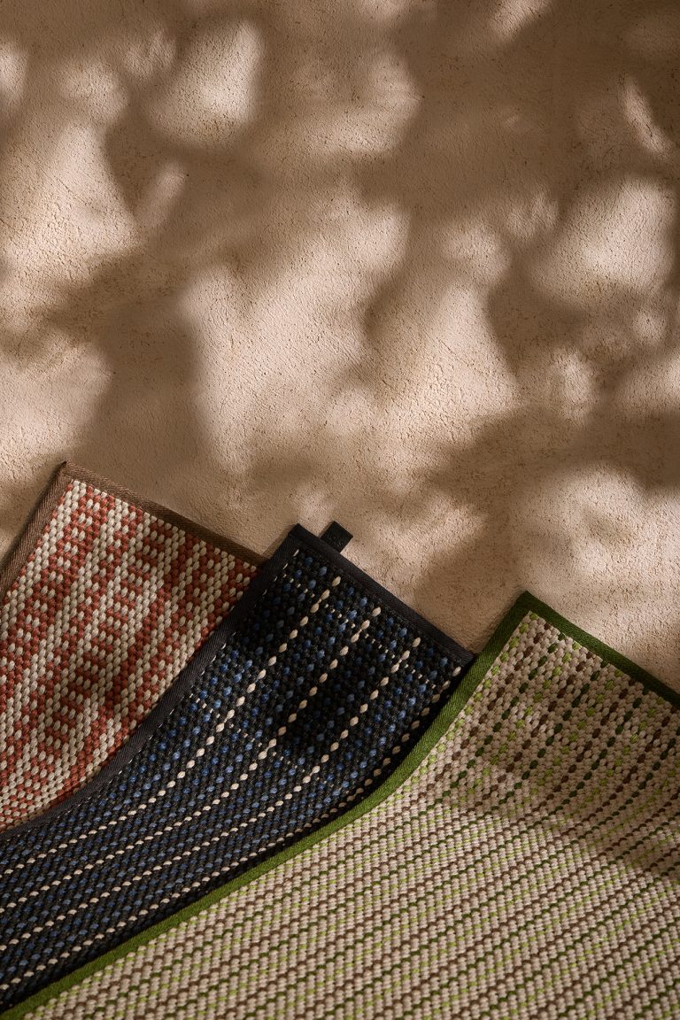 Made from recycled PET plastic bottles, this rug is suitable for both indoor and outdoor use. Its weave withstands exterior conditions without sacrificing softness, creating a surface that warms, welcomes and blends naturally with its surroundings.