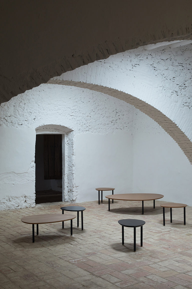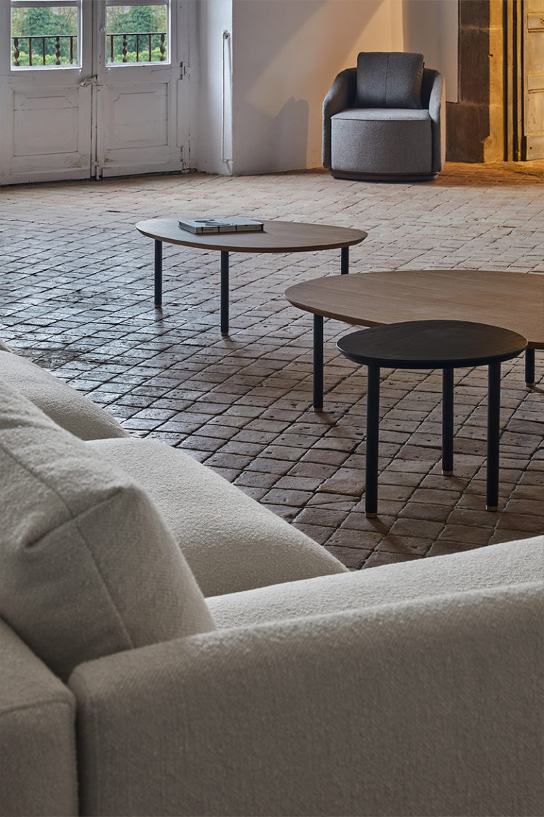 A collection of oval-shaped wooden tables available in three sizes and heights, which allows for them to be nested and combined creating dynamic sets. The tops are available in oak, walnut or a wide range of lacquered finishes, while the legs are repeated in black with a light brass finish.