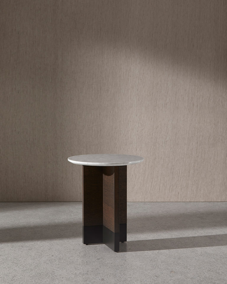 Collection of coffee, occasional and bedside tables comprising circular top made in black or white marble, MDF in lacquer or oak veneer with structure in oak or lacquer. Slate micro-textured lacquer base.
