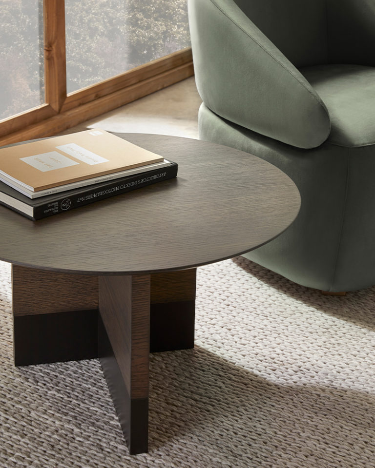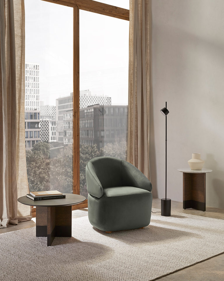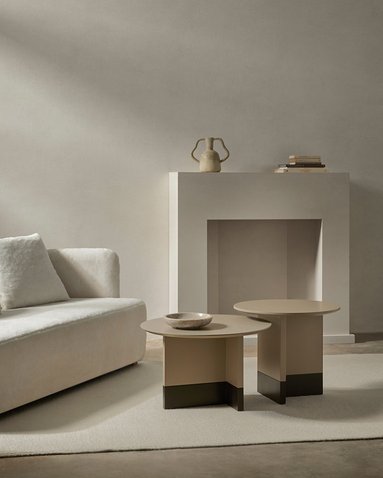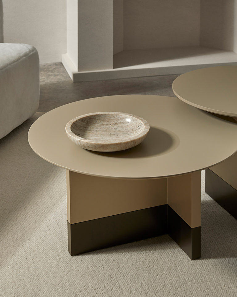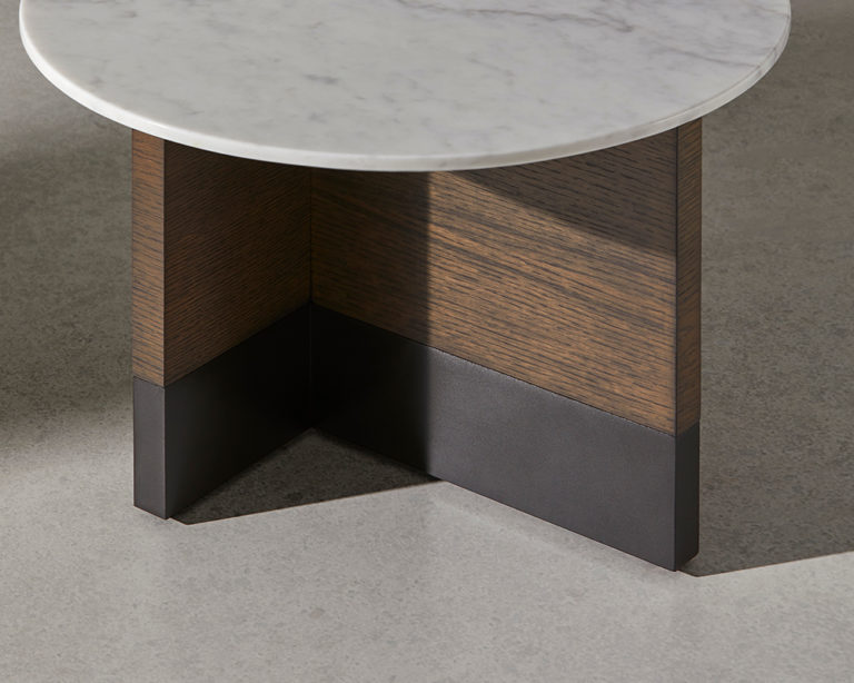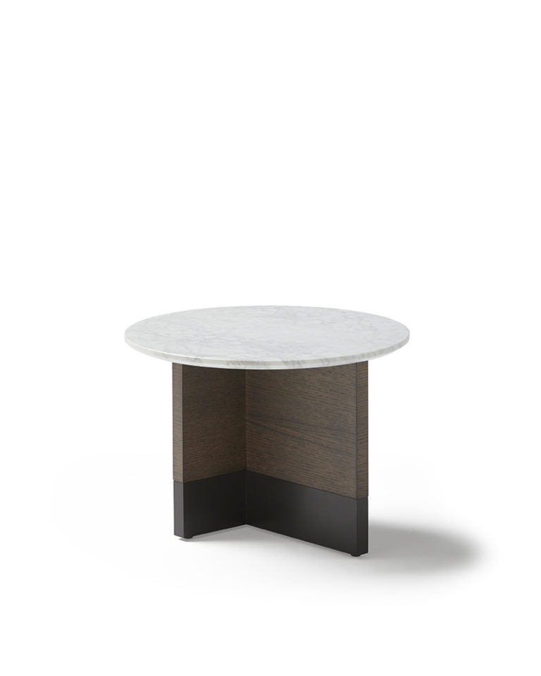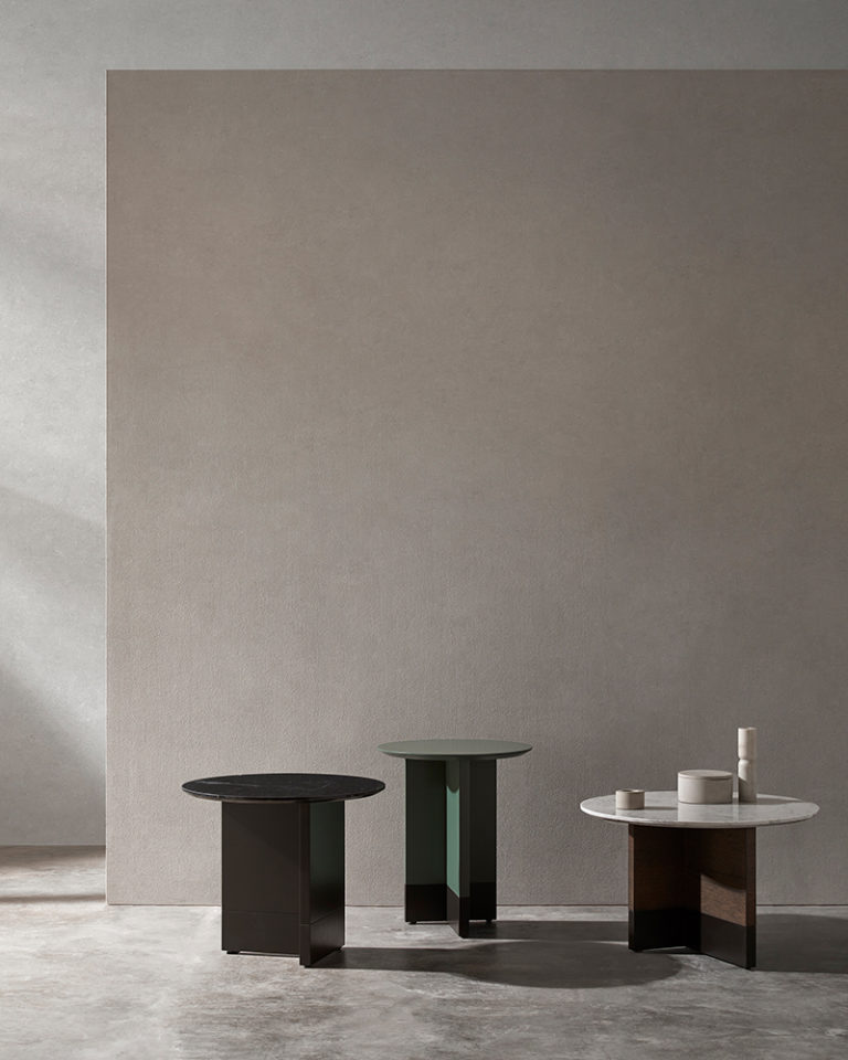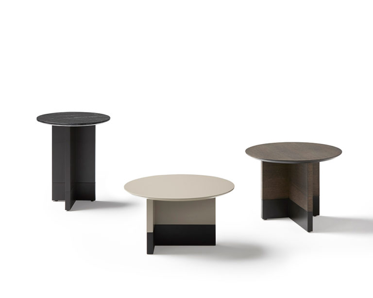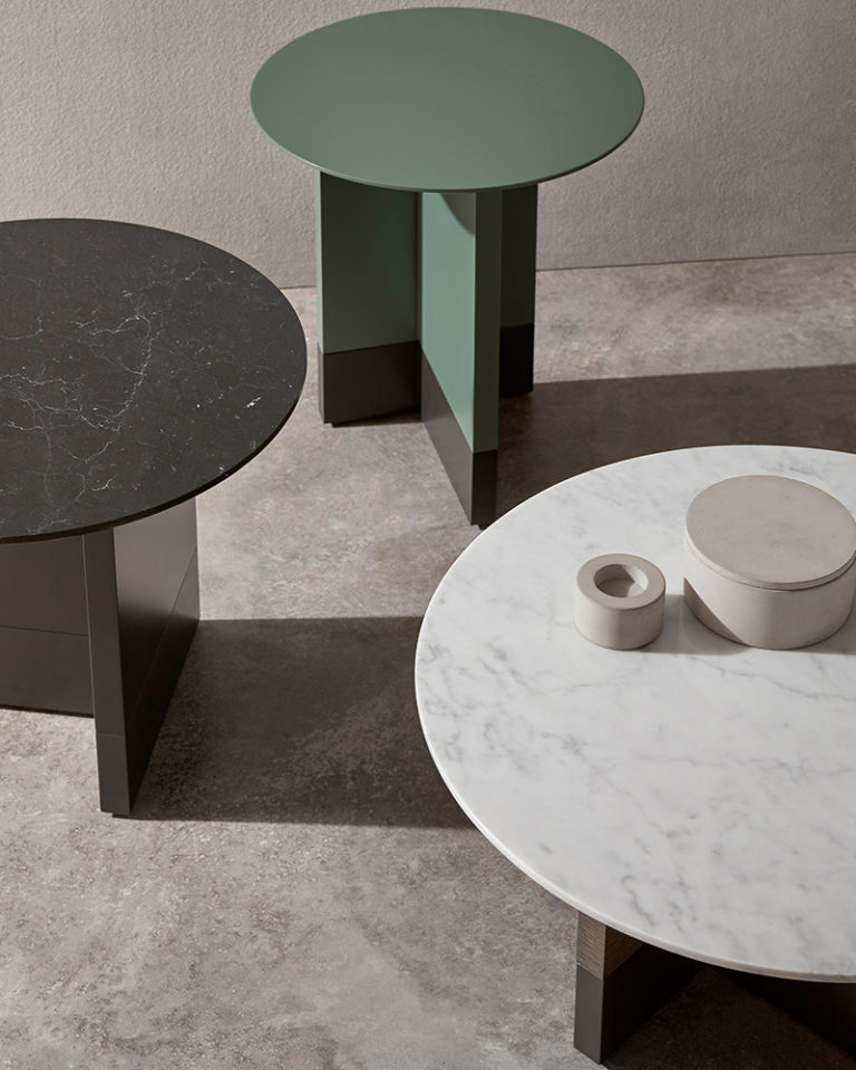Collection of coffee, occasional and bedside tables comprising circular top made in black or white marble, MDF in lacquer or oak veneer with structure in oak or lacquer. Slate micro-textured lacquer base.