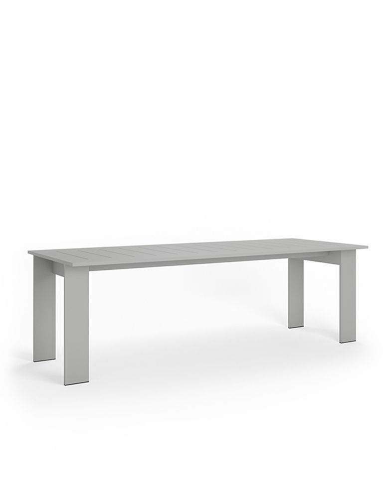 Las líneas sobrias y racionalistas de esta mesa de exterior, de corte rectilíneo y contundente, dibujan una pieza de gran presencia y versatilidad estética, capaz de encajar en entornos de estilo muy diverso. Observando en detalle su diseño, se percibe cómo juega con los diferentes planos y dimensiones de las lamas para conseguir una sutil expresión gráfica como único ornamento.