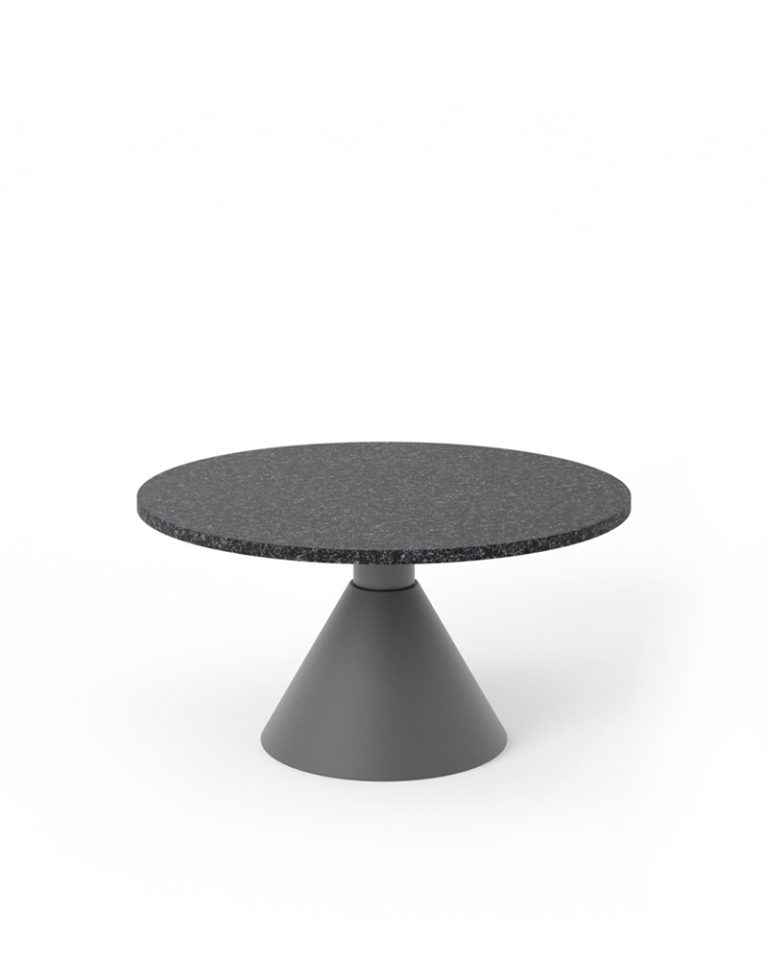 Una colección de mesas auxiliares que toma su nombre de las baterías musicales, y cuya sencillez geométrica y circular está pensada para mejorar la melodía de cualquier propuesta de mobiliario exterior. Esta versión de base cónica está fabricada en aluminio y una superficie sólida ultracompacta con acabado en piedra natural