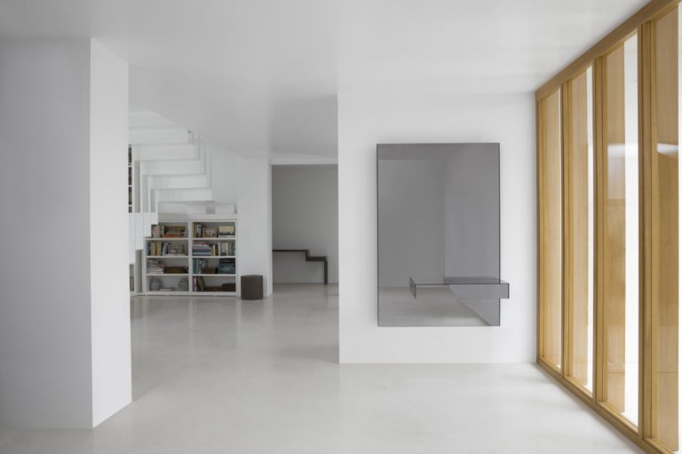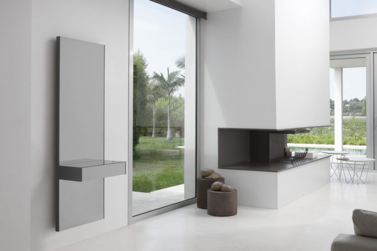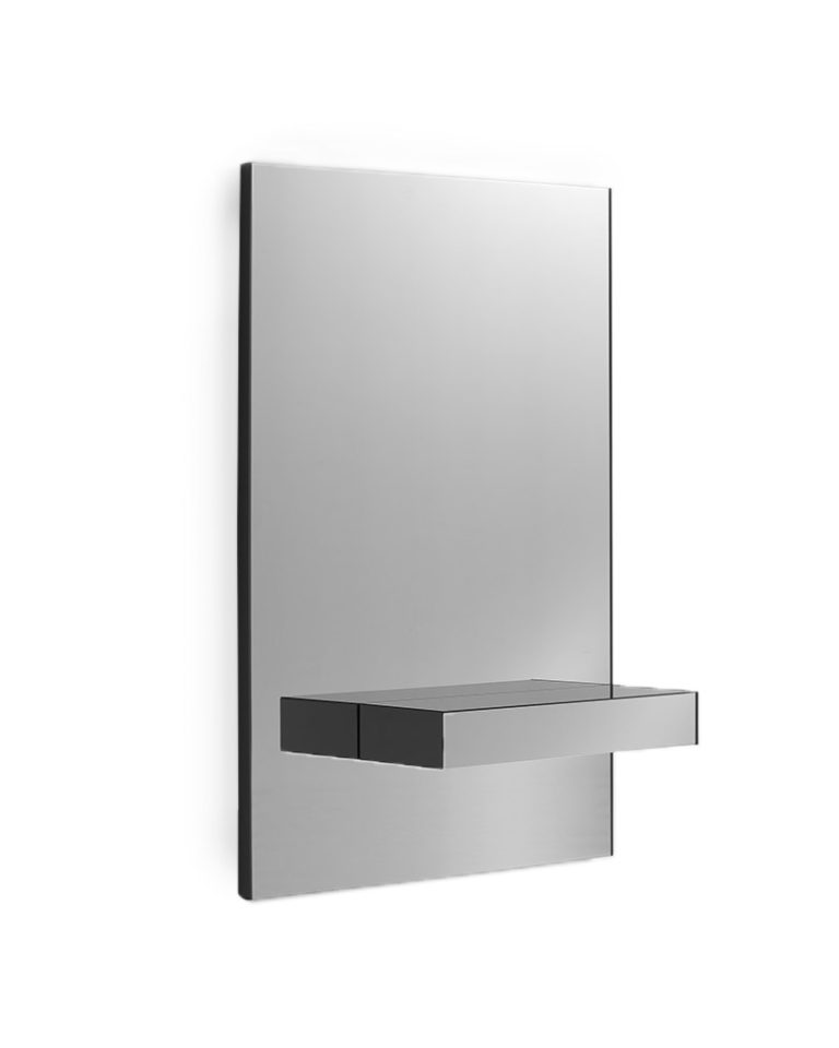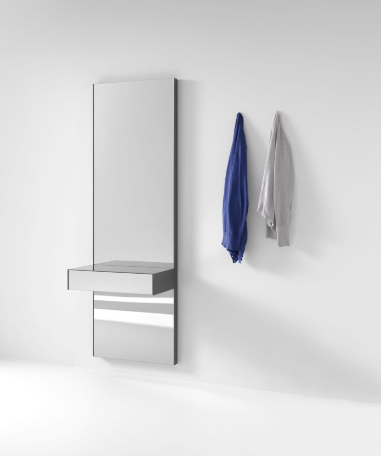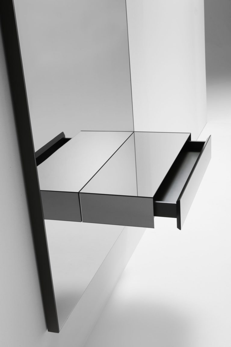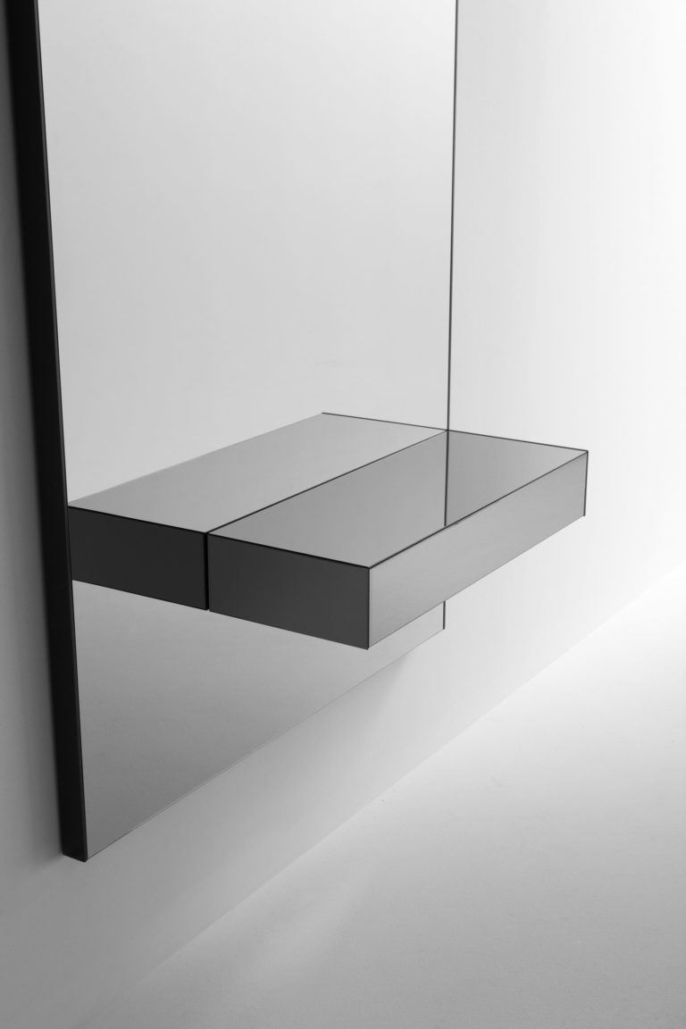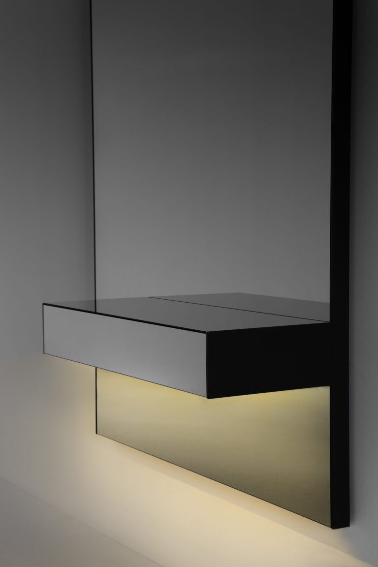 Una colección de consolas compuestas por un panel trasero con espejo fumé gris y un cajón en el mismo material. Disponible en dos alturas, opcionalmente es posible integrar en la base inferior del cajón una luminaria de LED de luz indirecta (contacta con info@rihouse.shop).