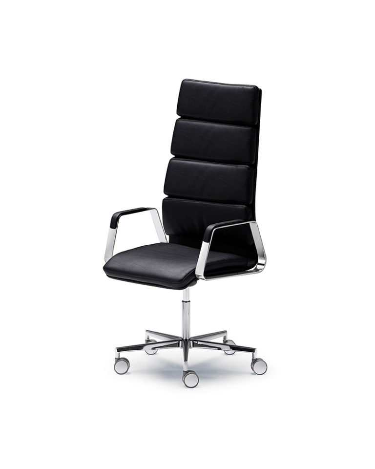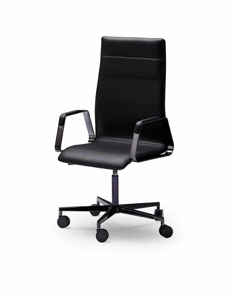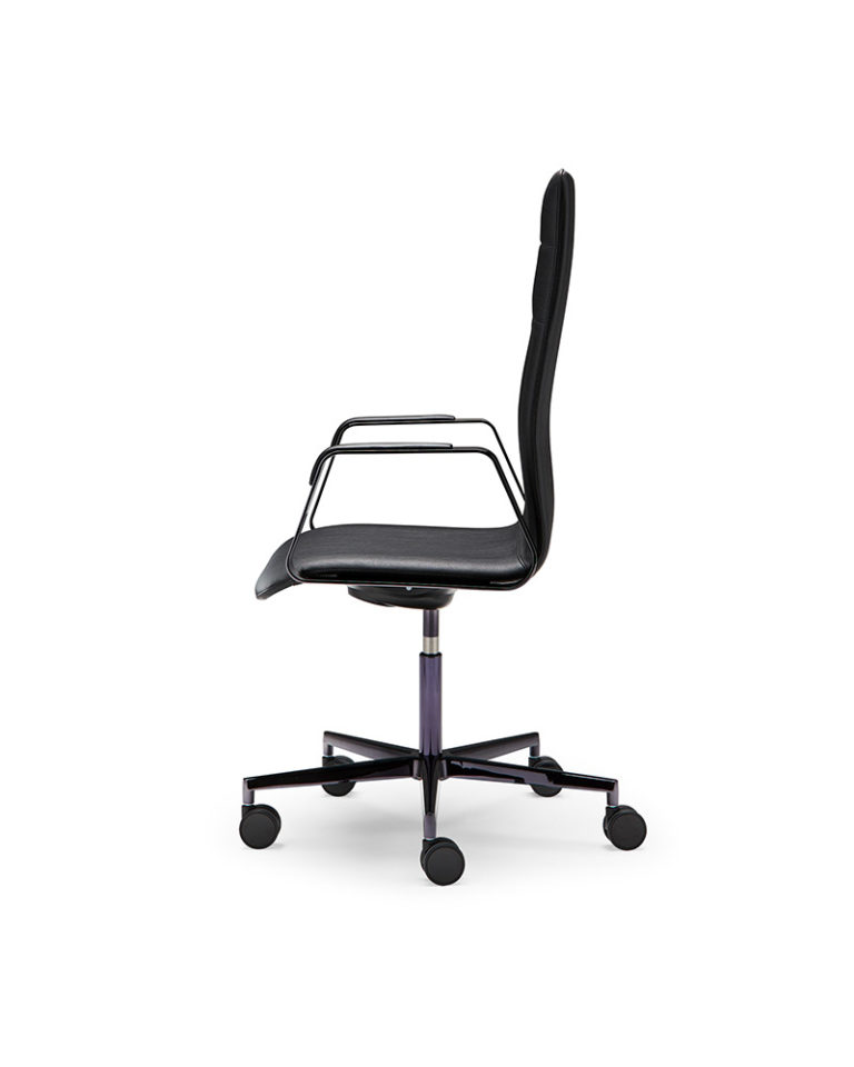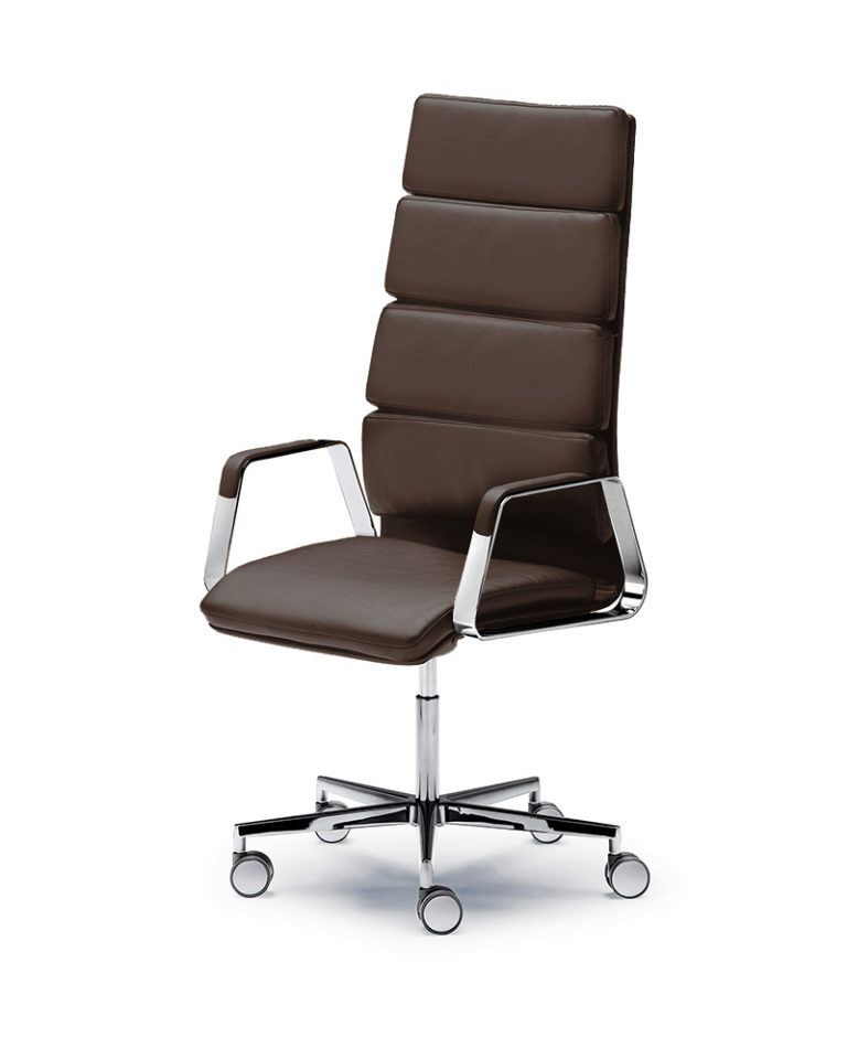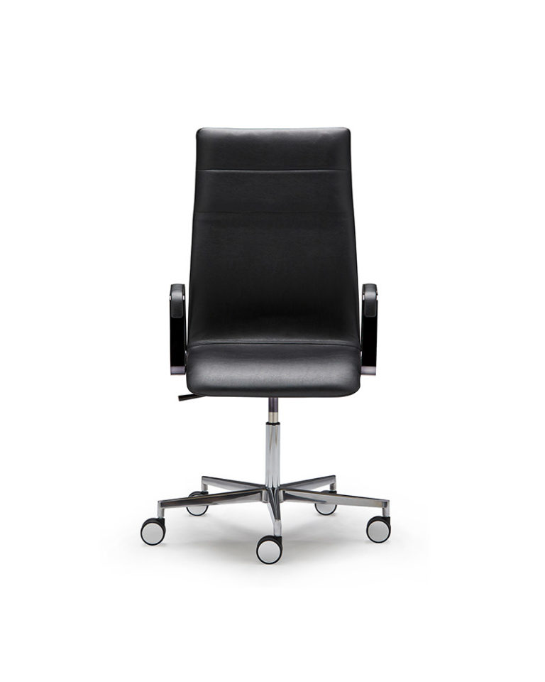 La silla de trabajo ONNA, con respaldo alto, es funcional y refinada. Un diseño nostálgico, que traduce la configuración de la clásica silla de oficina a unas proporciones contemporáneas. Tapizada en piel técnica, para una mejor comodidad, a su versión confort se le incorpora un asiento y respaldo acolchado de mayor densidad. Base de cinco ejes con ruedas. Sistema basculante, ajustable en altura e inclinable.