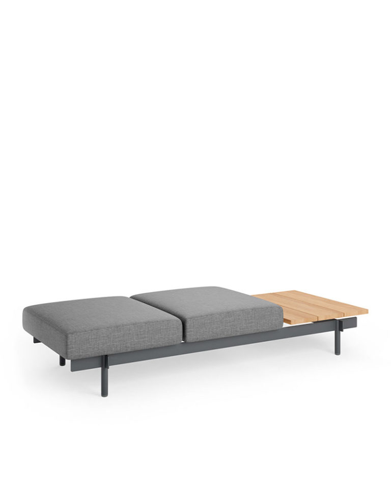 Con un esquema limpio y refrescante, este banco de exterior se caracteriza por una estructura de aluminio que mezcla pletinas rectangulares con patas tubulares. Los cojines, de alta resistencia, conviven con una superficie de madera de iroko que funciona como mesa auxiliar.